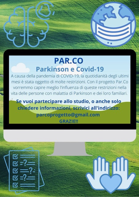 Lo studio denominato più sinteticamente PAR.CO ha l’obiettivo di indagare l’impatto delle restrizioni legate al contenimento dalla pandemia SARS-CoV2 sul benessere psicologico e fisico delle persone con diagnosi di malattia di Parkinson e/o parkinsonismi, e dei caregiver che li assistono.