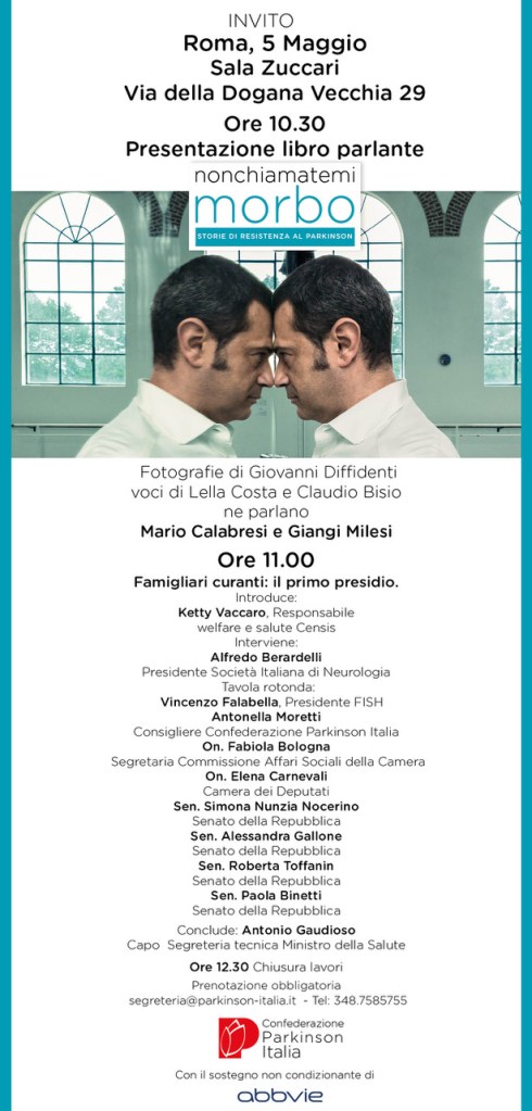 L’incontro in Sala Zuccari di Palazzo Giustiniani sarà aperto alle ore 10:30 dalla presentazione dell’audiolibro fotografico Non Chiamatemi Morbo. Storie di resistenza al Parkinson, che racconta le storie di resistenza al Parkinson in sorprendenti immagini di Giovanni Diffidenti e in brani teatrali recitati dagli attori Lella Costa e Claudio Bisio.
