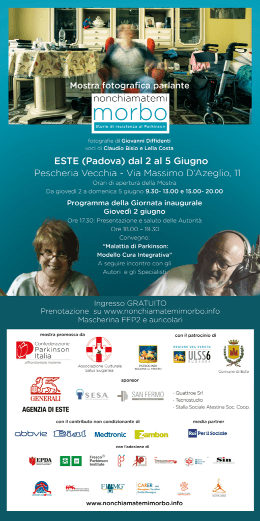 Promossa da Confederazione Parkinson Euganea e dall’Associazione Culturale Salus Euganea, con il patrocinio della Regione Veneto, ULSS 6 Euganea e il Comune di Este, la mostra “Non Chiamatemi Morbo” si terrà ad Este (PD) presso Pescheria Vecchia, in via Massimo d’Azeglio 11, da 2 al 5 giugno.