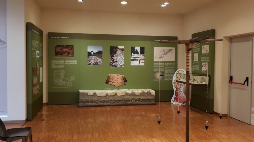 Nella sala verde vengono trattate la particolarità geografica della centuriazione e le sue modalità di realizzazione, con il supporto di pannelli esaustivi e l’esposizione di strumentazioni specifiche, come la groma.